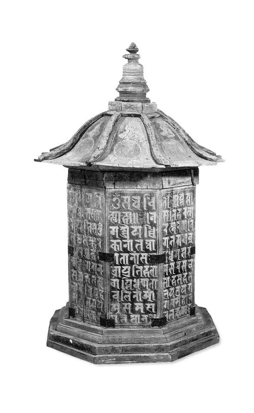 西夏木緣塔為西夏墓葬中第一次發(fā)現(xiàn)的西夏葬器。該塔通高75厘米,塔頂邊沿寬47厘米,呈四層八角形,飾紅色;分塔座、塔身、塔頂和塔剎四部分。塔座為四級(jí)八邊臺(tái)階。塔身為八邊柱體形,由長(zhǎng)34厘米、寬12.5厘米、厚2厘米的八塊木板合成,表面涂藍(lán)色,每邊有黃色工整梵文“陀羅尼”,并用漢文注明陀羅尼經(jīng)名。塔頂為傘式八邊形,每邊彩繪云氣紋和一個(gè)梵文字,內(nèi)有墨書(shū)“故考任西經(jīng)略司都案劉德仁,壽六旬有八,于天慶五年歲次戊午四月十六日亡歿,至天慶七年歲次庚辰(申)口夏十五日建緣塔,至中秋十三日入課訖”。塔剎圍欄為八邊形,其他相輪、覆缽、剎頂都是圓形,由下向上收分;底座周圍繪有卷草紋。