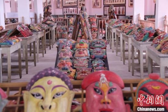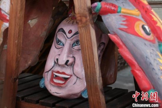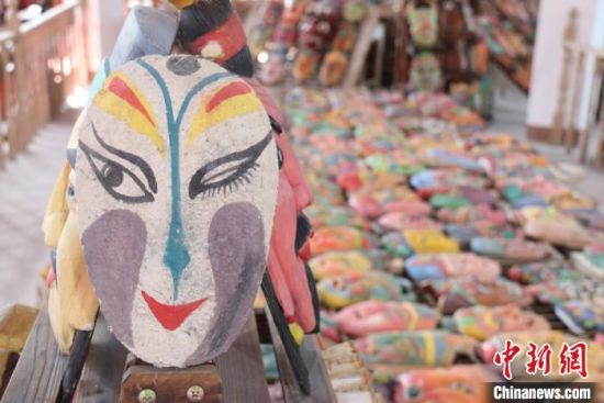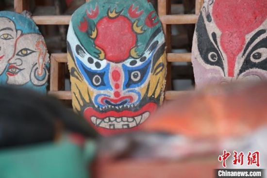 圖為陳列于蘭州市七里河區(qū)一民俗文化館中的儺面具,色彩復(fù)古,造型別致。 閆姣 攝