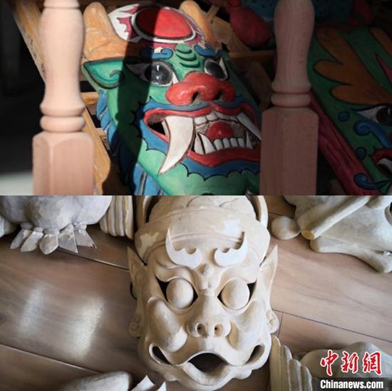 儺面具是儺文化中儺祭、儺儀時(shí)使用的道具,又被稱為“刀尖上的古老表情”。圖為未上色和已上色的儺面具對(duì)比。 閆姣 攝