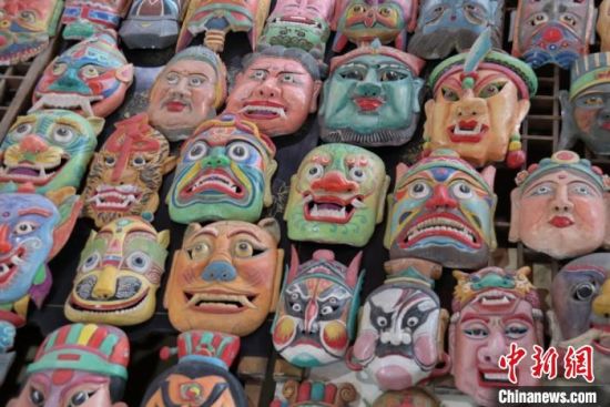 西北儺面具色彩豐富,紅色、白色、灰色、藍(lán)色、金色分別有其色彩寓意。圖為表示造型各異的儺面具?!¢Z姣 攝