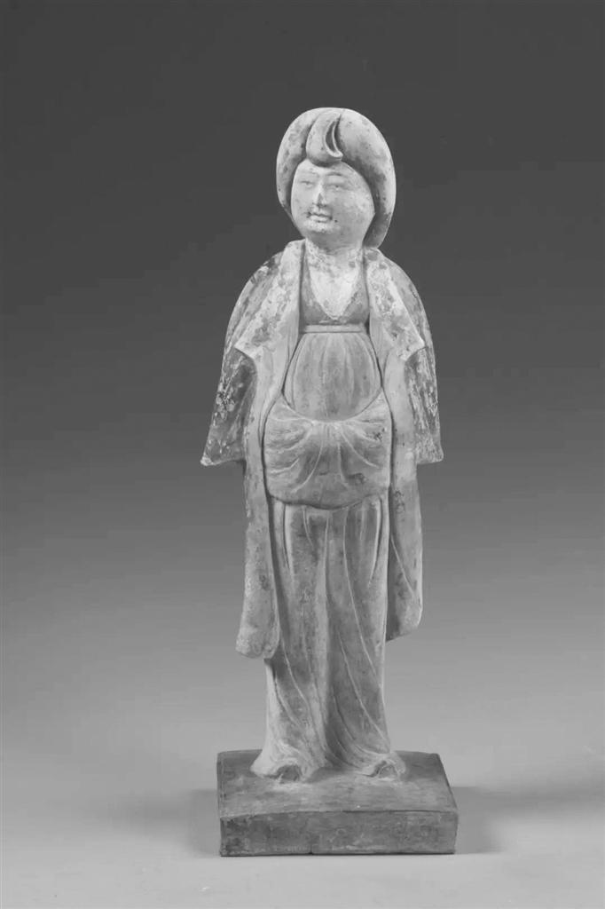 正大氣象,不僅在書法,也滲透到了民眾日常生活中。甘肅慶城博物館收藏有一件彩繪貴婦俑。這是唐開(kāi)元十八年(730 年)的作品,雙手籠于胸前,站在方形臺(tái)座之上,一副唐代貴婦的裝扮。