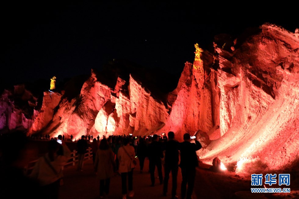 張掖七彩丹霞景區(qū)萬(wàn)象土林谷華燈閃爍。新華網(wǎng)發(fā)(童張偉 攝)