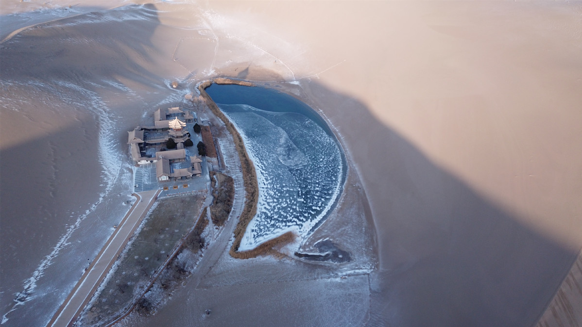 圖為:12月11日,落雪后的月牙泉靜美如畫(huà)。