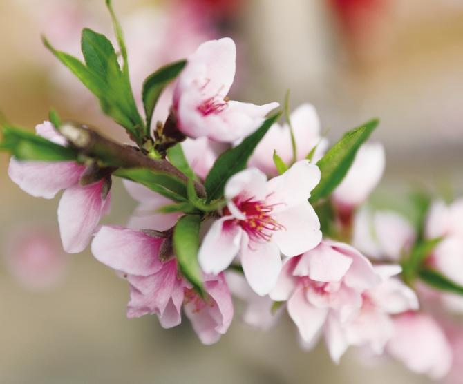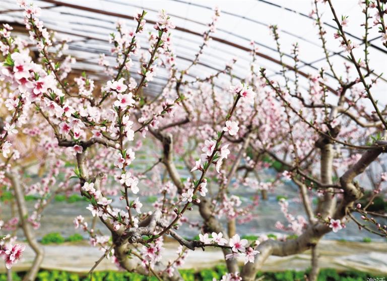 掀起兩層厚重簾子,哇!一片桃花正艷,真是“桃之夭夭灼灼其華”的美景。棚外一片寒冬生命蕭條,沉寂寧靜之靜景,棚內卻成仲春生命伸展,嫩葉初展,鮮花綻放的動態(tài)。油桃樹最高1.8米,大小相間,形狀各異,枝丫被種植者剪成錯落有致,折回分叉,不重疊、透光好的唯美造型。一根根長短各異的枝條,綴滿了嬌艷的要么正在綻放粉紅色花朵,要么含苞欲放的花蕾。尤其花間那一簇簇一寸來長的滴翠綠初葉,更是令人欣慰十足!你要是凝視一棵樹上的某一枝,你就會被粉紅的笑臉慢慢陶醉,陶醉其鮮嫩從外到內紅色由淡到濃的神奇五瓣,其色彩變化,均是自然造就的神來之筆,每一個花瓣一如少女翹起的小嘴唇,是那樣的調皮,如此的逗人!她們聚在一起,訴說著那些生命的奧秘!那一簇簇燃燒正紅的花蕊之針,各自頂著一顆顆金黃的珠寶,又在蘊含著生命怎樣的走向?……