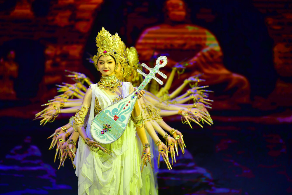 2021年9月24日,第五屆絲綢之路(敦煌)國(guó)際文化博覽會(huì)和第十屆敦煌行·絲綢之路國(guó)際旅游節(jié)在甘肅省敦煌市開幕。圖片為演員在開幕式上演出。新華社記者陳斌 攝