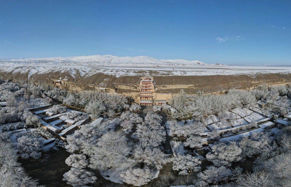 這是3月25日拍攝的敦煌莫高窟景區(qū)雪景(無(wú)人機(jī)照片)。新華社記者張智敏 攝