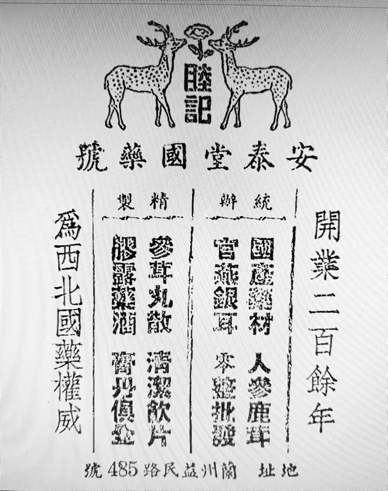 安泰堂作為百年老店,其廣告詞自然頗具氣場。首先明確定位:“開業(yè)二百余年、為西北國藥權(quán)威”,其次是統(tǒng)辦“國產(chǎn)藥材、人參鹿茸,官燕銀耳、零整批發(fā)”,最后是本店特色,精制“參茸丸散、清潔飲片,膠露藥酒、膏丹俱全”。
