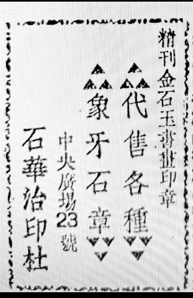 最后要提到的一則廣告也與文化有關(guān)。蘭州和平日報社1947年出版的《新蘭州》一書中,曾刊登石華治印社廣告,其廣告詞曰:“精刊金石玉書畫印章、代售各種象牙石章”,社址在中央廣場23號,其創(chuàng)辦者即為隴右印壇名宿駱石華先生。駱石華先生1920年生人,彼時未及而立,尚未入白石先生門下;筆者家外祖解放前供職中央廣場郵局,當(dāng)年曾與石華先生相交。今偶于舊籍中覓得石華治印社當(dāng)年廣告,恭錄于此,既為本文收尾,亦為家外祖與石華先生半個世紀(jì)友誼之緬懷。