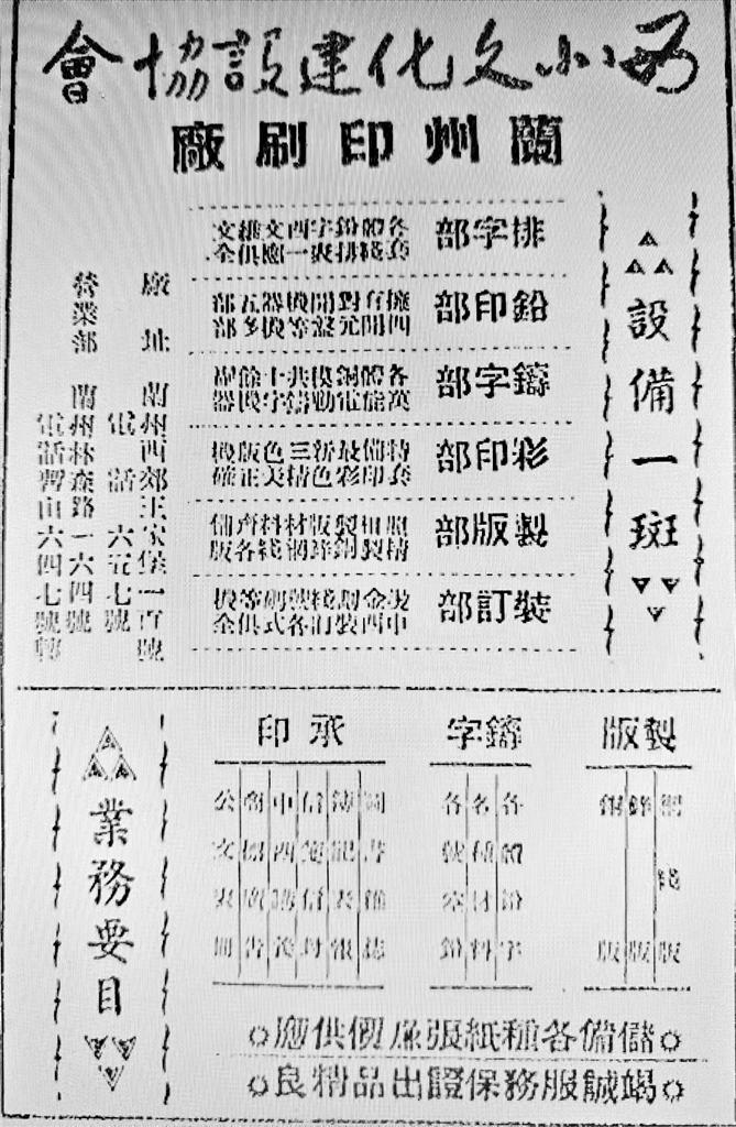 個別有實(shí)力的印刷廠也通過廣告拓展業(yè)務(wù)。如創(chuàng)辦于1947年9月的西北文化建設(shè)協(xié)會蘭州印刷廠是當(dāng)時甘肅規(guī)模較大的印刷廠之一,曾印制過《蘭州古今注》《花兒集》《西北論叢》《新光》等書刊。據(jù)當(dāng)年廣告所載,該廠內(nèi)設(shè)排字部、鉛印部、鑄字部、彩印部、制版部、裝訂部,承印范圍亦頗廣,包括圖書雜志、傳記表報、信箋信封、中西講義、商標(biāo)廣告、公文表格等。