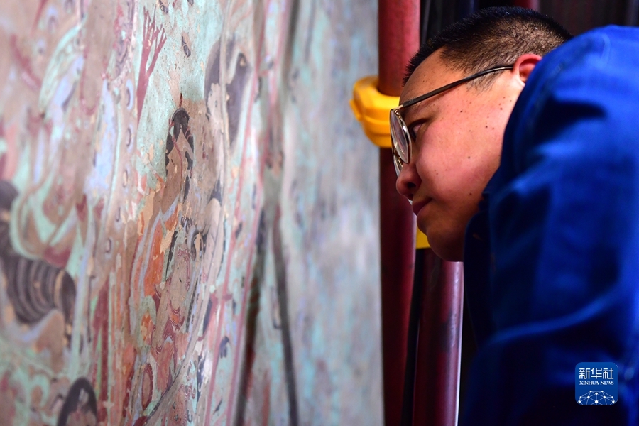 4月19日,在莫高窟第231窟,楊金禮在修復出現(xiàn)病害的壁畫。新華社記者 杜哲宇 攝