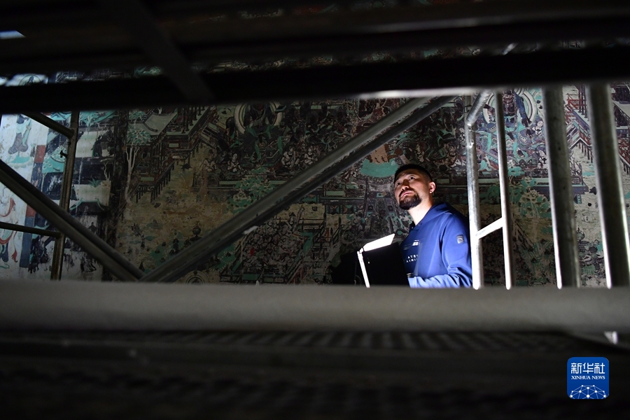楊金禮今年35歲,他2006年就來到莫高窟,從學徒做起,逐漸成長為敦煌研究院文物保護技術服務中心的一名壁畫修復工作者。楊金禮每天都會和同事來到洞窟內(nèi)“面壁修復”,通過專業(yè)技術手段解決壁畫產(chǎn)生的起甲、空鼓、酥堿等病害,幫助壁畫對抗時間的流逝。