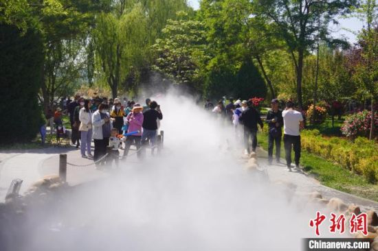 5月16日,甘肅蘭州,寓言故事園化身“瑤池”仙境美景,吸引不少市民前來(lái)觀賞、拍照?!【琶赖┰觥z