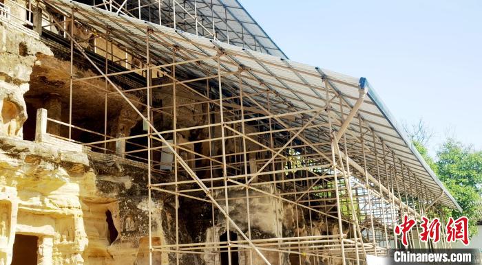 在北石窟寺,多體量多結(jié)構(gòu)腳手架支撐起保護(hù)棚,窟龕輪廓若隱若現(xiàn)。崔惠萍介紹說,該防水工程,屬于實驗性,于2021年3月建成,能最大程度覆蓋遮擋崖體,保護(hù)崖面窟龕,防止雨水對石窟的沖蝕破壞。