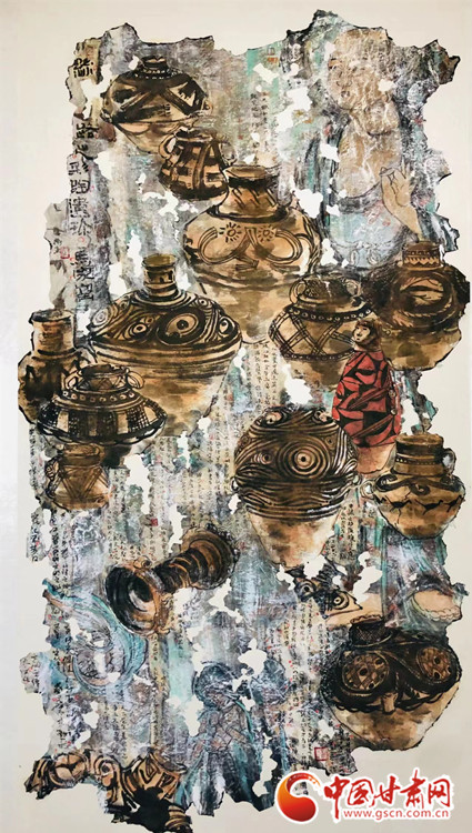 他的這幅作品《絲路遺珍-馬家窯》于2018年獲甘肅美術(shù)專業(yè)最高獎(jiǎng)“金駝獎(jiǎng)”,采用黃河的“s”型構(gòu)圖展開(kāi),將八千年前新石器時(shí)代大地灣文化、馬家窯文化的經(jīng)典代表器物分次展開(kāi)。作品左上角及中間部分依次疊加,穿插,繪制中與敦煌文化中的壁畫(huà)、飛天、佛像有機(jī)結(jié)合,寓示絲路文化有序傳承、源遠(yuǎn)流長(zhǎng),又對(duì)畫(huà)面的視覺(jué)撥高提升。