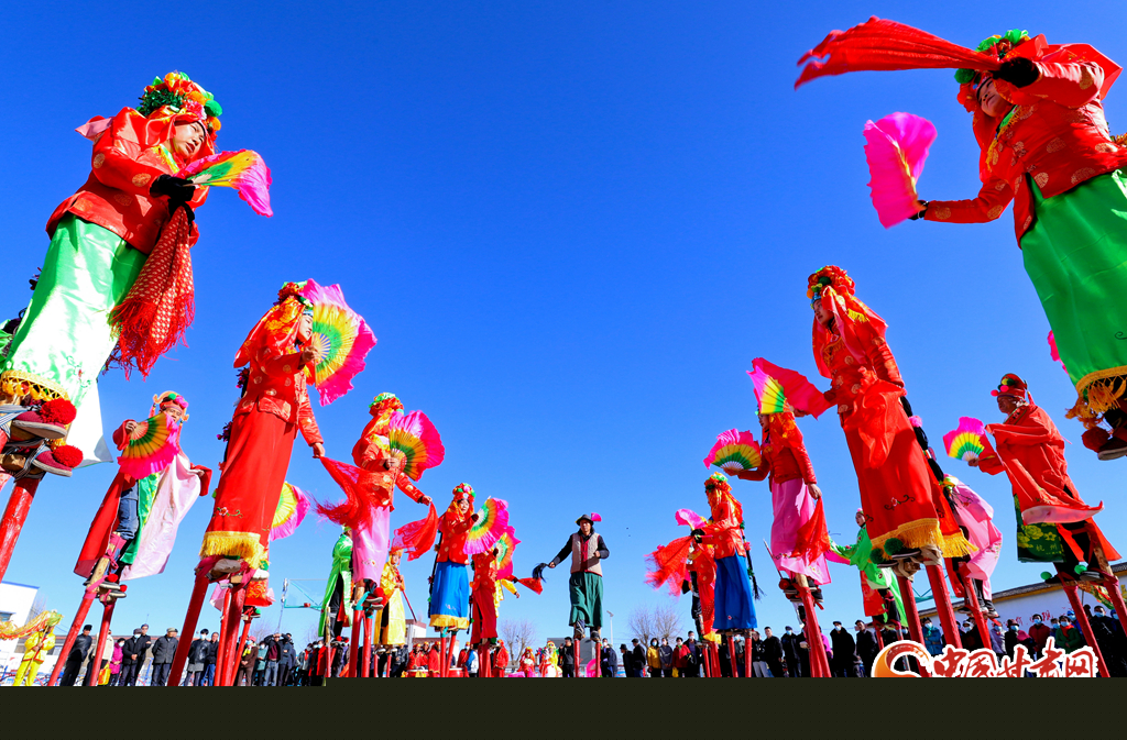 1月9日,甘肅省張掖市甘州區(qū)花寨鄉(xiāng)的社火表演隊(duì)正在文化廣場(chǎng)上加緊排練。