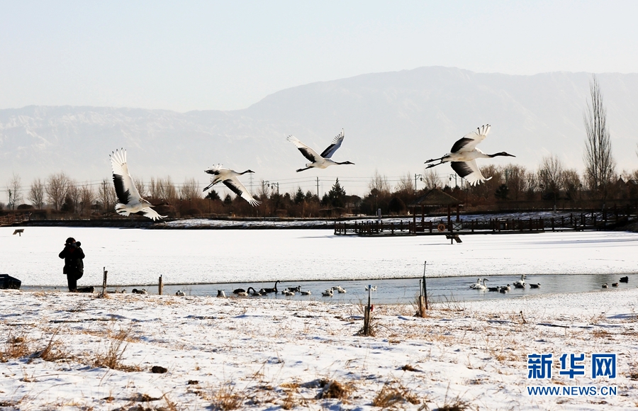 2月14日,雪后初晴,甘肅省張掖國(guó)家濕地公園放飛的十余只丹頂鶴翩翩起舞、嬉戲覓食,使雪后的濕地公園充滿生機(jī)。新華網(wǎng)發(fā)(陳禮 攝)