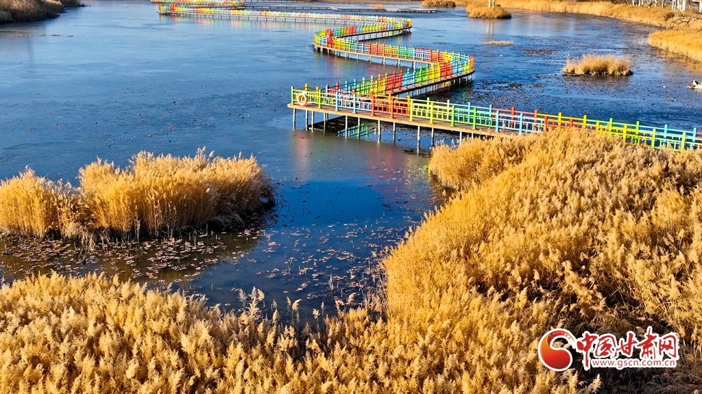 初冬時節(jié),張掖黑河濕地國家級自然保護(hù)區(qū)的蘆葦、蒲草等植物在秋風(fēng)、冬霜的吹拂下都變成了金黃色,密密的蘆花舞動著裊娜的身姿,倩影婆娑,蘆葦叢里鳥鳴啾啾,整個濕地成為了一片金色的童話世界,讓人產(chǎn)生無限遐思。