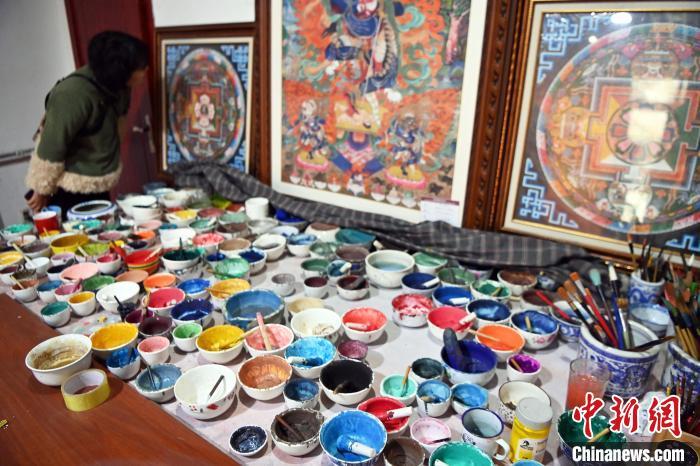 圖為唐卡小鎮(zhèn)一畫(huà)室內(nèi)擺出大大小小已完成的唐卡和各色顏料。唐卡具有鮮明的民族特點(diǎn)和獨(dú)特的藝術(shù)風(fēng)格,采用金、銀、珍珠、瑪瑙、珊瑚、松石、孔雀石、朱砂等珍貴的礦物寶石和藏紅花、大黃、藍(lán)靛等植物為顏料。九美旦增 攝