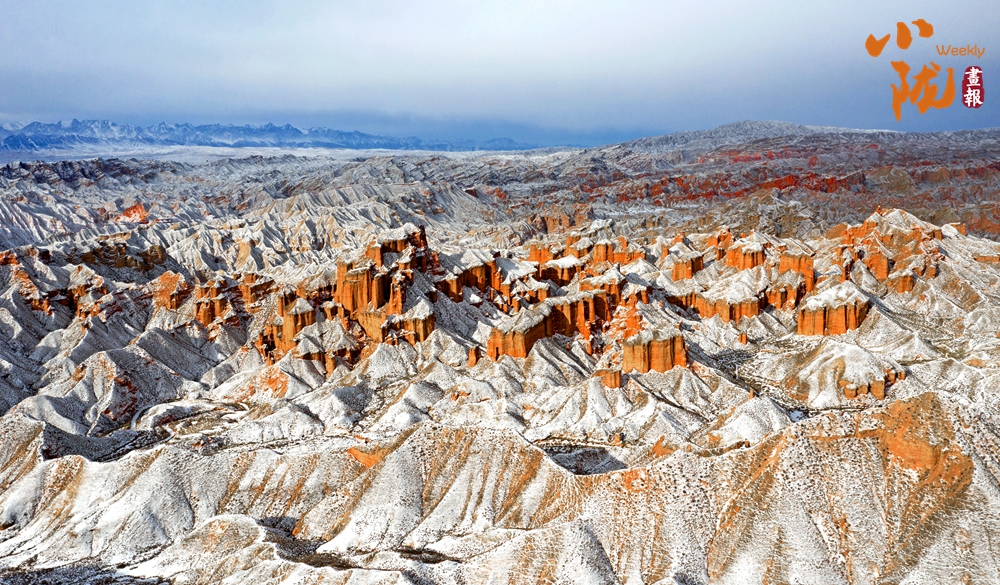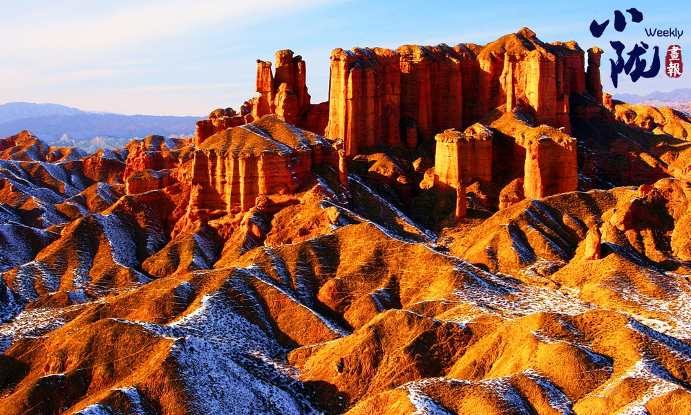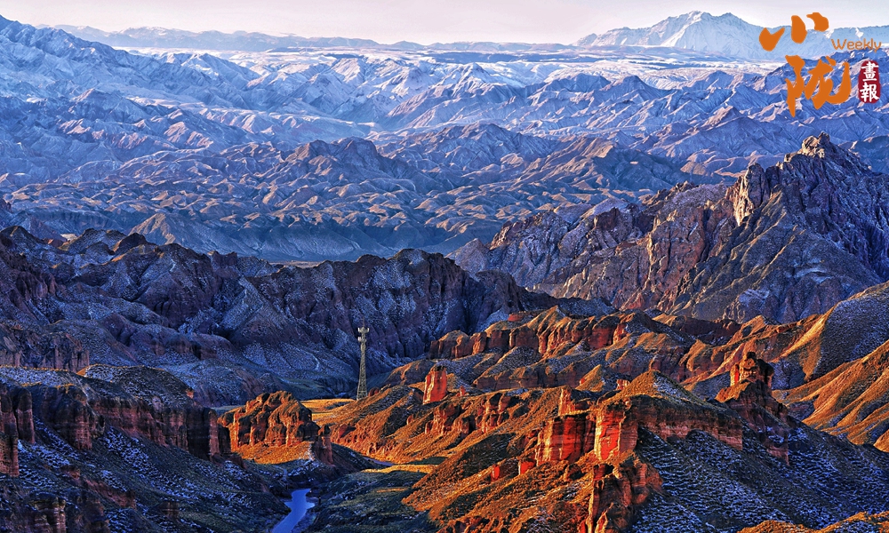 雪后,赤紅色的丘陵充滿陽(yáng)剛之美,白雪宛如輕紗浸在丹霞山上,顯得格外艷麗多彩、如夢(mèng)如幻。