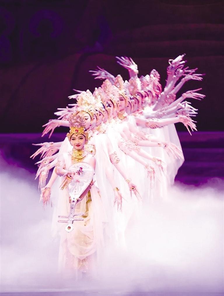 經(jīng)典舞劇《絲路花雨》歷經(jīng)45載,累計(jì)演出3952場(chǎng),觀眾達(dá)537.47余萬(wàn)人次,享有“中國(guó)民族舞劇的典范”“東方的《天鵝湖》”之稱。演出現(xiàn)場(chǎng),劇中經(jīng)典舞蹈選段《金光千佛》《反彈琵琶》《霓裳羽衣舞》《夢(mèng)幻伎樂天》為游客粉絲和廣大觀眾繽紛綻放,引發(fā)陣陣歡呼。“反彈琵琶”源自莫高窟第112窟的反彈琵琶樂舞圖,“千手觀音”還原了莫高窟元代3窟中的千手千眼觀音圖,“活著的敦煌壁畫”、獨(dú)創(chuàng)的“S”形舞姿讓游客沉浸式感受絲路文化藝術(shù)的魅力。