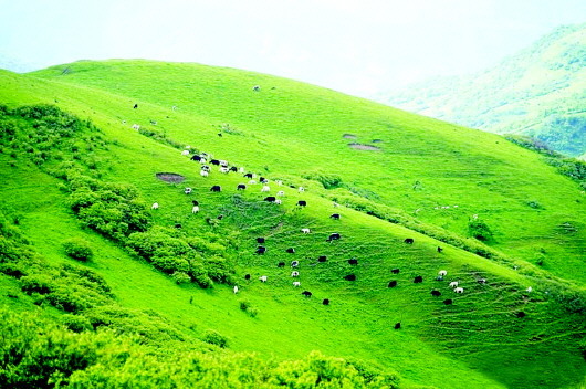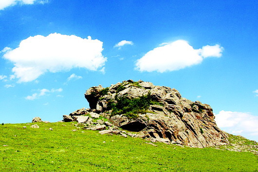 秦人遠(yuǎn)去了,只留下那些讓后人至今懷想不已的地名,諸如石鼓山、景墩梁、牧馬梁、上店子、下店子、大卜峪、瓦泉峪等,而尤以石鼓山最為著名,著名得連那部白發(fā)三千丈的《水經(jīng)注》里,都記載著它的故事:“山在梧中聚,有石鼓不擊自鳴,鳴則兵起。漢成帝鴻嘉三年,天水冀南山有大石自鳴,聲隱隱如雷,有頃止,聞?dòng)谄较宥偎氖?,野雞皆鳴。石長(zhǎng)丈三尺,廣厚略等,在崖勒,去地百余丈,民俗名曰石鼓。”石鼓山是朱圉山最高峰,海拔2625米,山峰陡峭,人跡罕至,遠(yuǎn)望如石鼓,近看似臥牛,茂林幽泉,森秀無比。初春時(shí)節(jié),萬(wàn)物透綠而石鼓白雪皚皚;大雨前夕,飛鳥翱翔而山上煙云彌漫。更為神奇的是,山丘之巔,突兀一石,酷似一頭臥北朝南的耕牛,翹首做犀牛望月之狀,人稱臥牛山。臥牛山石頸之下,有一巨石,其面圓而平,每當(dāng)正午陽(yáng)光直射之時(shí),遠(yuǎn)遠(yuǎn)望去,石面宛如獸皮所蒙,恰如一面威風(fēng)凜凜的巨型戰(zhàn)鼓,恍惚之中,有如雷聲隱隱而來,民呼之曰石鼓,石鼓山因此得名。石鼓山素來以厚重的人文歷史和優(yōu)美的草原風(fēng)光而著稱,尤為聞名的“石鼓擎雪”,自古就是“甘谷八景”之一。千百年來,石鼓山甘愿舍棄繁華,遠(yuǎn)離人世,在淡泊寧?kù)o的歲月中,固執(zhí)而堅(jiān)定地守望古坡,守望古坡人家。