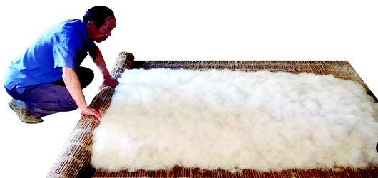 他一邊介紹一邊演示,先用白土揉進(jìn)羊毛,吸掉油氣,再用彈弓加工松軟,并用手拍打鋪放均勻。搟氈前,還要撒面粉,通常中等大小的毛氈摻兩斤多面粉,以增加黏性和柔性。之后還要淋上開水,高溫瞬間會(huì)使羊毛變軟。