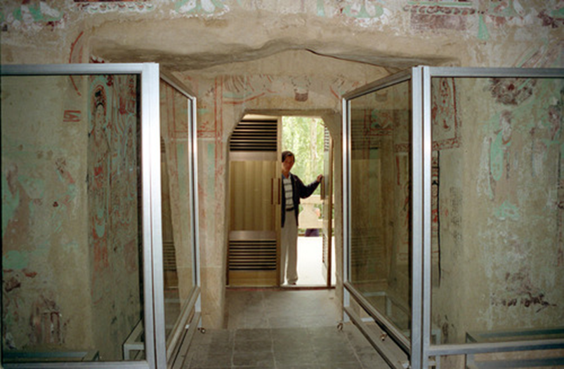 圖為莫高窟的367個洞窟安裝了鋁合金窟門,并在94個開放的洞窟安裝了玻璃屏風(fēng),即保護(hù)了壁畫的彩塑,又不影響參觀者視線。新華社記者彭張青攝(1996年11月24日發(fā))