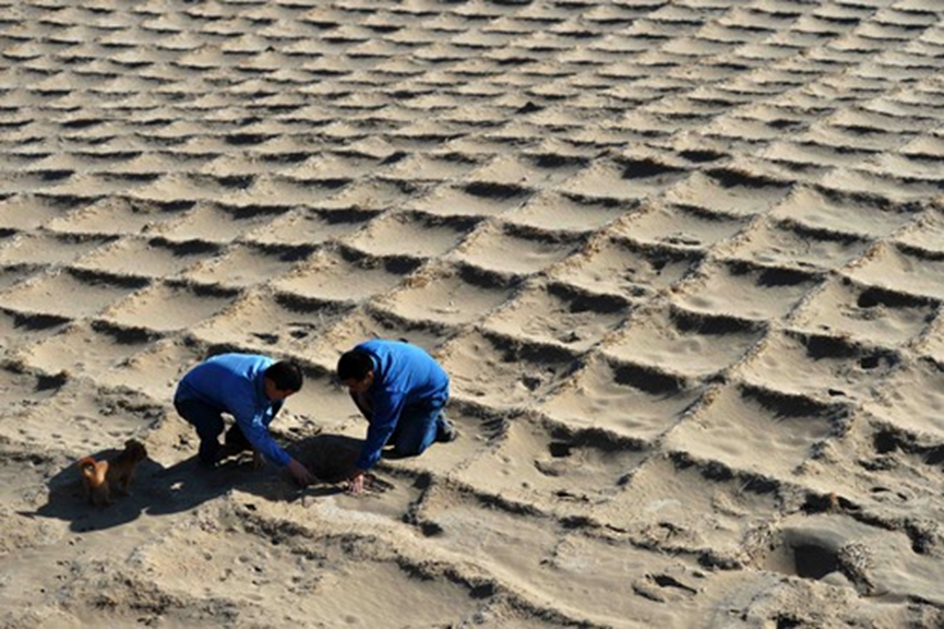 記者從敦煌研究院了解到,到2014年,經(jīng)過70年持續(xù)風(fēng)沙治理,風(fēng)沙對敦煌莫高窟的危害顯著降低,進(jìn)入窟區(qū)年積沙量減少85%以上。據(jù)敦煌研究院保護(hù)所副所長汪萬福介紹,在幾代治沙人的努力下,莫高窟頂已形成由防沙障阻沙、沙生植物林帶擋沙、麥草方格沙障固沙和礫石壓沙組成的風(fēng)沙防治綜合體系,極大減緩了風(fēng)沙對敦煌壁畫和塑像等文物的危害,改善了窟區(qū)生態(tài)環(huán)境。圖為2014年8月29日,兩名工作人員檢查用于固沙的麥草方格。新華社記者陳斌攝