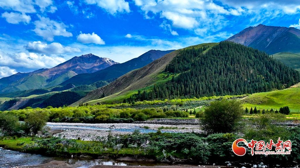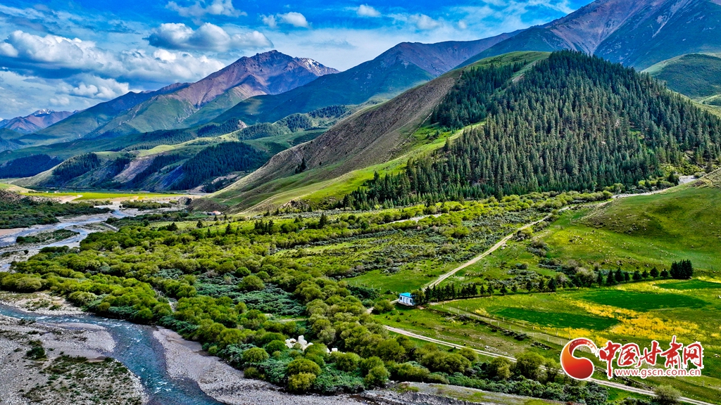 7月2日,祁連山國(guó)家公園甘肅省張掖市肅南裕固族自治縣大河鄉(xiāng)段,在高原藍(lán)天白云映襯下,群山環(huán)抱、 雪峰高聳,鳥鳴聲陣陣的濕地、奔騰不歇的黑河水、猶如“巨幅綠毯”的草原,勾勒出一幅風(fēng)光壯美的生態(tài)畫卷。