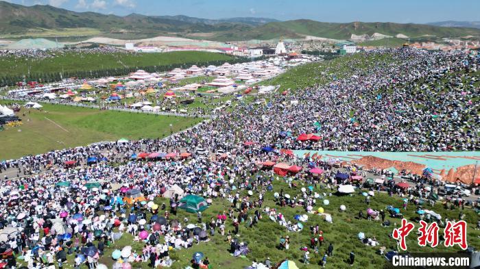 8月4日,人們在當周草原觀看九色甘南香巴拉旅游藝術節(jié)開幕式表演。當日,第22屆九色甘南香巴拉旅游藝術節(jié)在甘肅省甘南藏族自治州當周草原開幕。人們身著節(jié)日盛裝載歌載舞、歡聚一堂,馬隊巡游、千人鍋莊舞等活動精彩上演。九色甘南香巴拉旅游藝術節(jié)既是民眾浪山聚會的節(jié)日盛會,也是展現發(fā)展成就、擴大對外開放的重要窗口,更是展示民俗文化、促進廣泛交往交流交融的有效載體。(無人機照片)中新社記者 九美旦增 攝