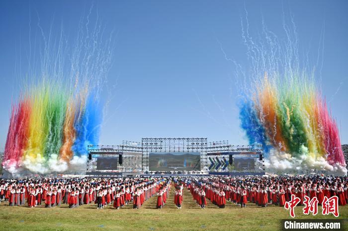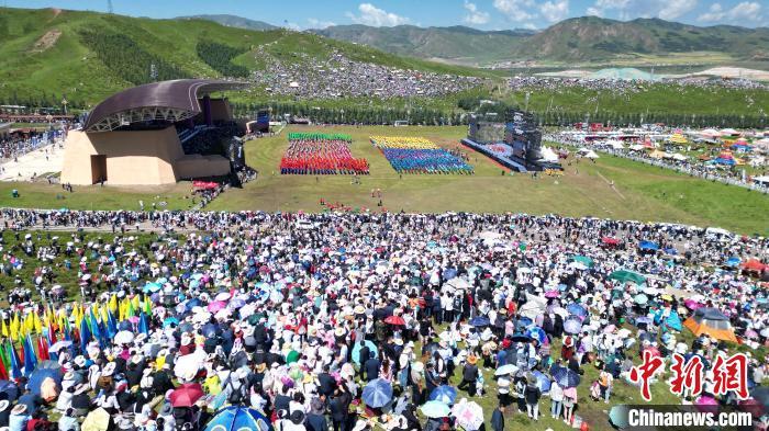 8月4日,第22屆九色甘南香巴拉旅游藝術節(jié)在甘肅省甘南藏族自治州當周草原開幕。人們身著節(jié)日盛裝載歌載舞、歡聚一堂,馬隊巡游、千人鍋莊舞等活動精彩上演。九色甘南香巴拉旅游藝術節(jié)既是民眾浪山聚會的節(jié)日盛會,也是展現發(fā)展成就、擴大對外開放的重要窗口,更是展示民俗文化、促進廣泛交往交流交融的有效載體。圖為開幕式現場。中新社記者 九美旦增 攝