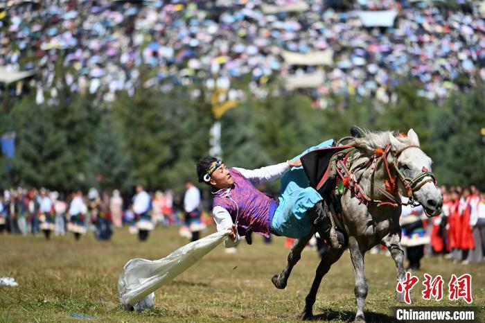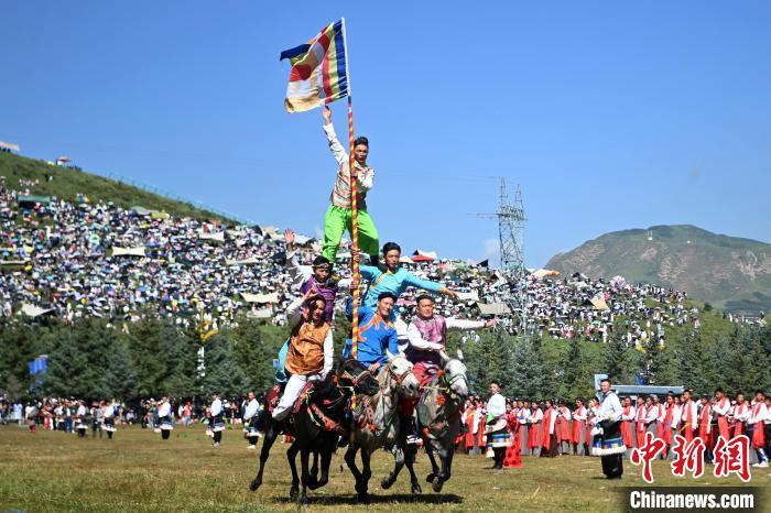 8月4日,藏族騎手在當周草原上表演馬術。當日,第22屆九色甘南香巴拉旅游藝術節(jié)在甘肅省甘南藏族自治州當周草原開幕。人們身著節(jié)日盛裝載歌載舞、歡聚一堂,馬隊巡游、千人鍋莊舞等活動精彩上演。九色甘南香巴拉旅游藝術節(jié)既是民眾浪山聚會的節(jié)日盛會,也是展現發(fā)展成就、擴大對外開放的重要窗口,更是展示民俗文化、促進廣泛交往交流交融的有效載體。中新社記者 九美旦增 攝
