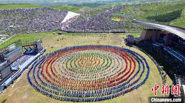 8月4日,第22屆九色甘南香巴拉旅游藝術節(jié)在甘肅省甘南藏族自治州當周草原開幕。人們身著節(jié)日盛裝載歌載舞、歡聚一堂,馬隊巡游、千人鍋莊舞等活動精彩上演。九色甘南香巴拉旅游藝術節(jié)既是民眾浪山聚會的節(jié)日盛會,也是展現發(fā)展成就、擴大對外開放的重要窗口,更是展示民俗文化、促進廣泛交往交流交融的有效載體。圖為開幕式現場千人鍋莊舞表演。(無人機照片)中新社記者 九美旦增 攝