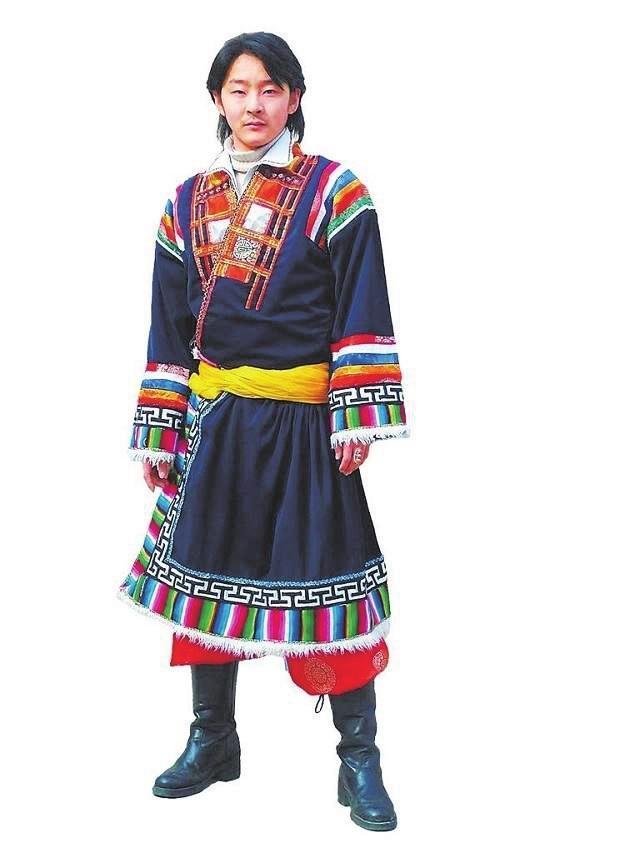 甘肅藏族因地理?xiàng)l件與生產(chǎn)生活方式的不同,可區(qū)分為牧區(qū)、農(nóng)區(qū)和半農(nóng)半牧區(qū)三種類型,相應(yīng)其服飾也有所差異,有生活裝和節(jié)日盛裝的區(qū)別。牧區(qū)服飾以甘南瑪曲、夏河為典型,男女都內(nèi)著半高領(lǐng)、左衽的滾邊夾襖,多用紅、綠、藍(lán)、褐色綢緞制作,喜歡用水獺皮等裝飾衣襟邊。夏日穿氆氌做的“日拉”,春秋穿羊羔皮做里,外罩綢緞面的“察日”,冬天穿大羊皮縫制的“早化”。男款袍服寬大,冬袍領(lǐng)子鑲豹皮;現(xiàn)代女款藏袍吸收了近現(xiàn)代旗袍的特點(diǎn),注意腰身的裁剪設(shè)計(jì),領(lǐng)部鑲豹皮,在領(lǐng)角處裝飾彩色布條;襟裙下擺和袖口處多疊綴三種紋樣的氆氌,或用白羔皮、水獺皮和織錦花邊依次裝飾。