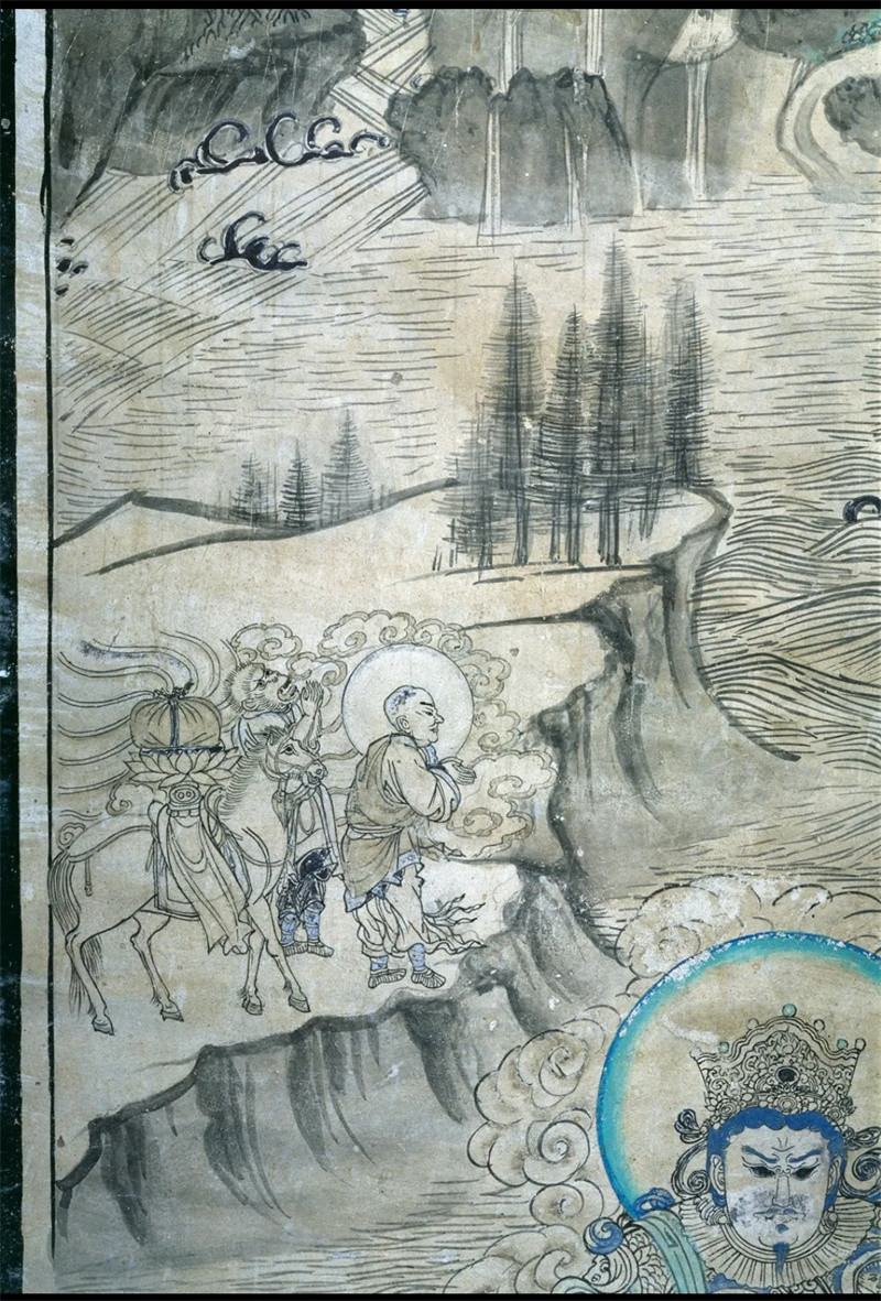 敦煌壁畫中現(xiàn)存六幅唐僧取經(jīng)圖,其中時(shí)代最早、保存最完好的一幅繪于西夏時(shí)期榆林窟第3窟的《普賢變》中。此幅唐僧取經(jīng)圖似是唐僧師徒在取經(jīng)途中遭遇難關(guān),誠心祈求菩薩協(xié)助渡難。圖中,唐僧身披袈裟,雙手合十,彎腰向前,遙望普賢菩薩參拜。唐僧身后,長相似猴的人雙手合十,抬頭仰望,向普賢致禮,他就是孫悟空的原型——石磐陀。師徒身后有一匹白馬,靜立等待。他們站在懸崖深壑前,面前呈現(xiàn)山窮水盡已無路的困境。