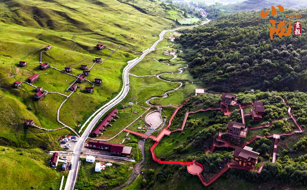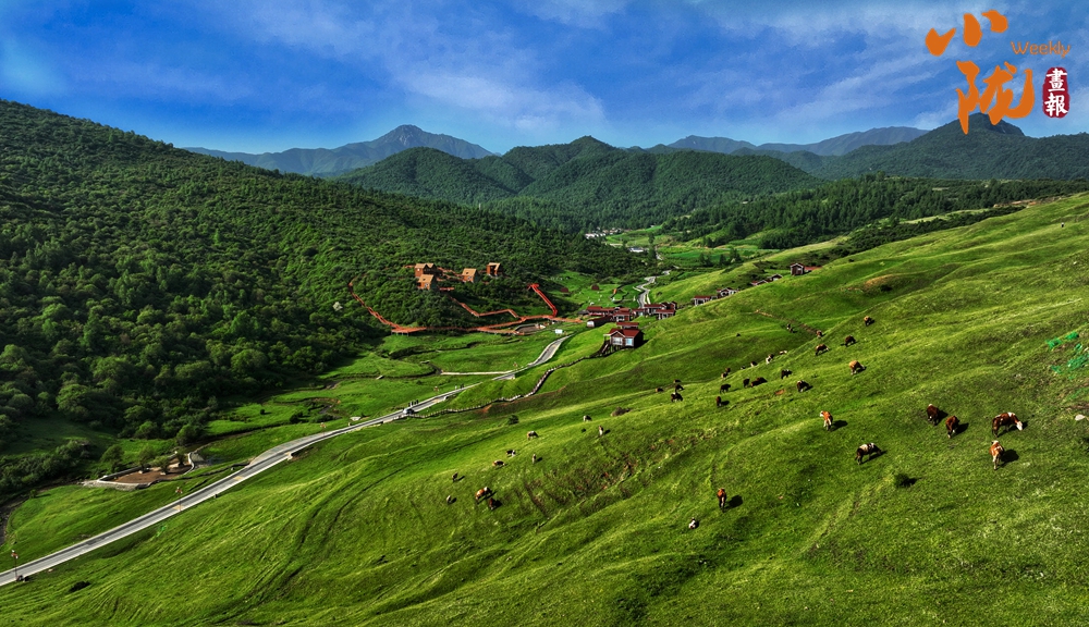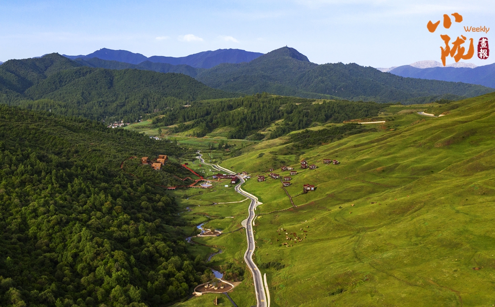 放眼望去,山峰起起伏伏,宛如鋪上了一層綠毯。山巒與草坡、森林及紅瓦白墻映入眼簾,景區(qū)道路伸向遠(yuǎn)方。