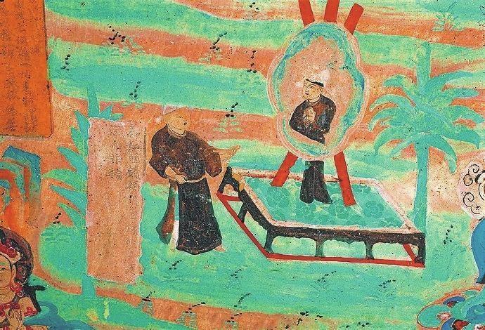 戰(zhàn)國(guó)時(shí)期楚國(guó)詩(shī)人屈原在《漁父》一文中寫道:“吾聞之,新沐者必彈冠,新浴者必振衣。安能以身之察察,受物之汶汶者乎?”意思是說(shuō)我聽(tīng)說(shuō)剛洗過(guò)頭的人一定會(huì)去彈彈帽子上的灰塵;剛洗過(guò)澡的人一定要抖抖衣服的灰塵。怎能讓清白的身體去接觸世俗塵埃的污染呢?當(dāng)年的敦煌人走出溫泉,在身心放松之后,就該靜觀返照自己了。在莫高窟第85窟中有一幅“曲花式鏡圖”:畫面上在一個(gè)正方形鏤空的底座上擺放著一個(gè)巨大的曲花式鏡,鏡子式樣別致,明亮澄澈。藍(lán)色的曲花式樣引人矚目。但畫面上最吸睛的是一位魁梧俊朗身著一襲赭色長(zhǎng)袍的男子,他正在鏡子前仔細(xì)地打量自己,而鏡中映射出他神情凝重的情態(tài)來(lái)。原來(lái),古人照鏡除了正衣冠之外,還有反觀自照的含義,在鏡子前良久地注視自己,就是對(duì)自己反省、頓悟的過(guò)程。“一年好景君須記”,走過(guò)四季,到了歲末,該是每個(gè)人回望來(lái)時(shí)路,展望前方的時(shí)候了。