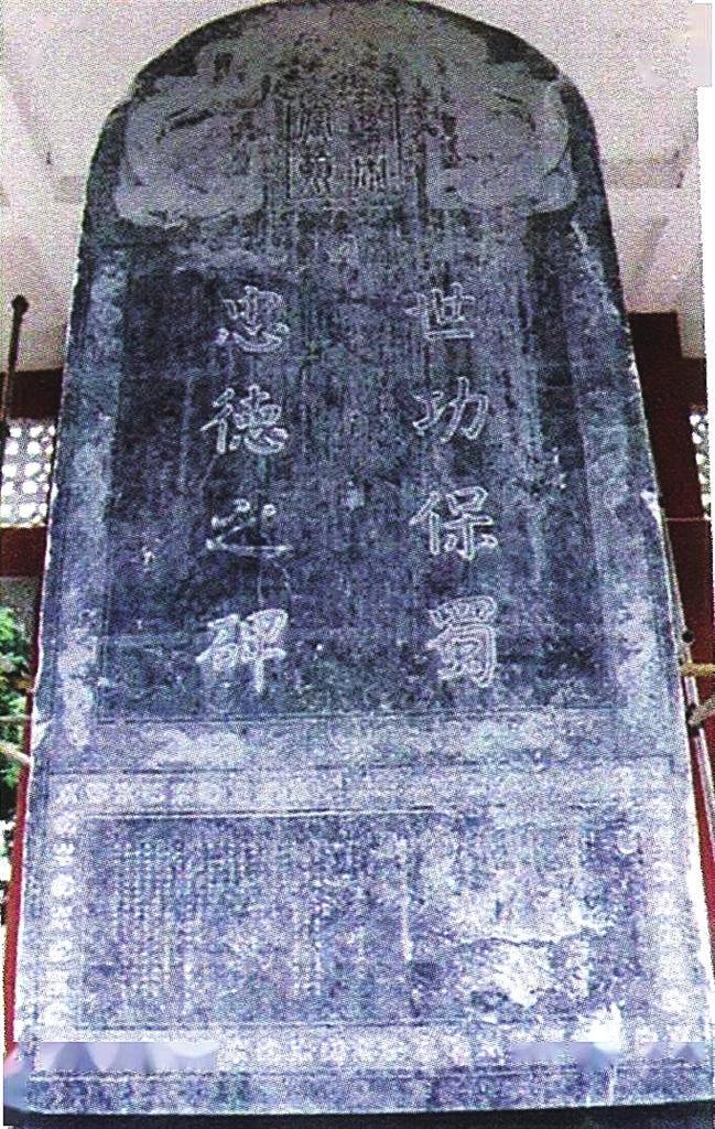 碑陽(yáng)額刻二龍圖,篆“皇帝宸翰”,字徑0.22米,碑身刻宋寧宗書(shū)“世功保蜀忠德之碑”八字,楷書(shū)豎行2行,行間刊有篆書(shū)“敕令寶璽”和楷書(shū)“修政殿書(shū)”八個(gè)小字,四周環(huán)刻八龍騰云圖。碑文刻吳挺之子吳曦自記《感恩表記》,碑文楷書(shū)計(jì)8461字,內(nèi)容記載吳氏三代抗金保蜀的功績(jī)。