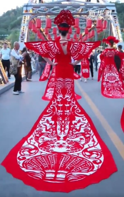 慶陽剪紙源于生活、講究情趣,是勞動人民生產(chǎn)生活、情感氣質(zhì)、觀念習俗和文化傳承的結晶。著名民俗學家靳之林先生稱剪紙藝人是“真正的藝術家”。1986年,中央美術學院邀請鎮(zhèn)原縣民間美術大師祁秀梅赴北京進行民間美術教學交流,向大學生演示民間剪紙。法國、日本、澳大利亞等國家的藝術家也多次專程到隴東考察民間剪紙藝術。慶陽剪紙已由鄉(xiāng)村婦女手中的小玩意,堂而皇之地步入了國家藝術殿堂——中國民間美術館,并在日、意、澳等國家展覽亮相。圖為身著慶陽剪紙服裝的模特們行走在蘭州中山橋上,驚艷了來往的游客。
