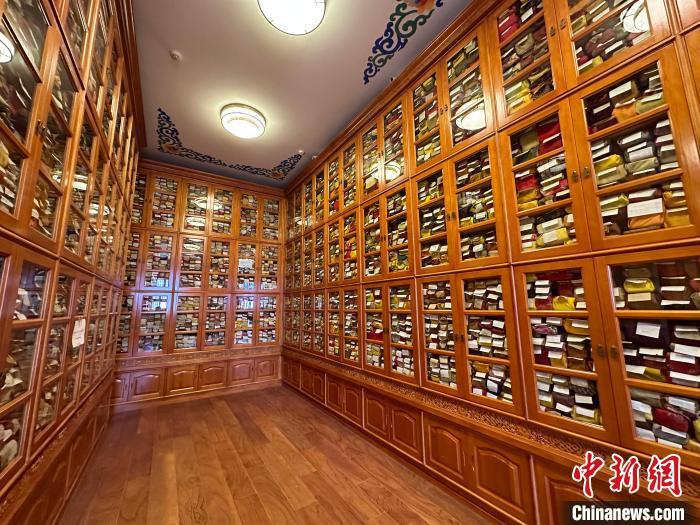 2月28日,修繕后的拉卜楞寺藏經(jīng)樓內(nèi),所藏古籍文獻(xiàn)整齊擺放于新書架上。中新社記者 丁思  攝