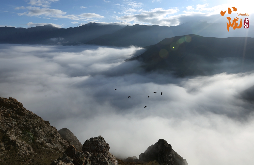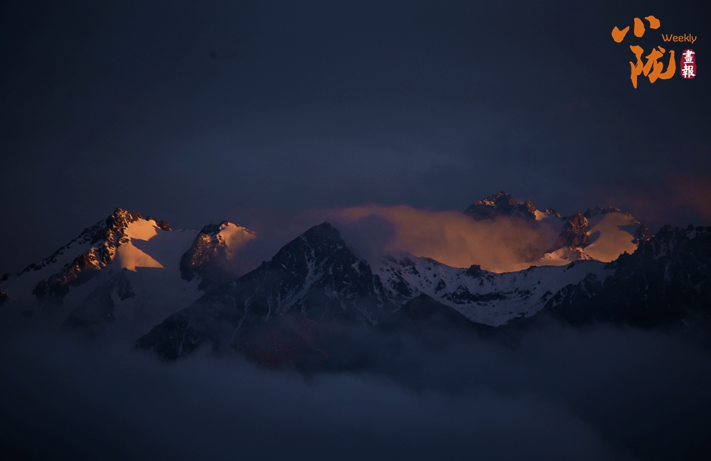 側(cè)目而視,近日一場(chǎng)降雪和夏日閑云相伴相依,近處的雪和遠(yuǎn)處的云相映成趣,共同把天空擦拭得深藍(lán)如鏡。這種“積雪長(zhǎng)留峰素裹,浮云飄忽去無(wú)邊”的夢(mèng)幻景色,會(huì)將你平日里積蓄在心頭的那些世俗凡塵濯洗得干干凈凈,有一種遠(yuǎn)離人世的幻覺(jué)。