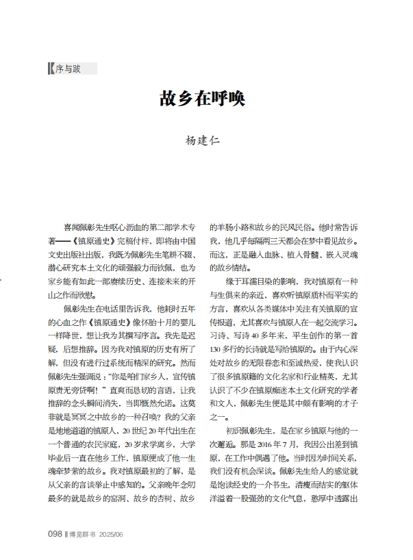 《博覽群書》期刊發(fā)表楊建仁文章《故鄉(xiāng)在呼喚》