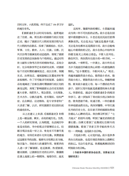 從上述意義上來講,《鎮(zhèn)原通史》稱得上是一部全面、真實、系統(tǒng)的地方史。當(dāng)然,一個人的研究領(lǐng)域、認知程度、生活閱歷畢竟是有限的,書中的觀點盡管博采眾長,但部分觀點也是一家之言,難免有不盡善盡美的地方,有待后來者補充和完善。我期望通過這部史書的出版,能夠充分發(fā)揮以史為鏡、知古鑒今、資政育人的重要作用,使更多的人進一步了解鎮(zhèn)原、走近鎮(zhèn)原、熱愛鎮(zhèn)原、建設(shè)鎮(zhèn)原,讓鎮(zhèn)原在歷史的長河中,像鑲嵌在黃土高原上的一顆明珠,璀璨奪目,流光溢彩。