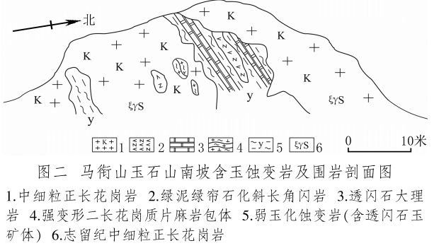 馬銜山玉礦分布在馬銜山東南部的玉石山(圖版一),海拔3028米。山上出露的地質體主要為古元古界馬銜山巖群、中元古代片麻二長花崗質巖[3]和志留紀正長花崗巖及正長巖。馬銜山巖群的巖性為黑云斜長片麻巖、變粒巖、斜長角閃巖和白云質大理巖,巖石普遍遭受了韌性變形,變余糜稜巖發(fā)育。志留紀巖漿侵入期后熱液活動較強,石英脈細脈發(fā)育,局部見螢石礦化或礦床[4]。玉礦化主要產于馬銜山巖群與志留紀正長花崗巖和正長巖接觸帶上(圖版二),具體賦存在與白云質大理巖的接觸部位,是正長花崗巖及正長巖與鎂質大理巖接觸交代蝕變的產物[5]?;◢弾r與片麻巖、變粒巖和斜長角閃巖接觸界線附近巖石雖有蝕變,但不見玉化蝕變巖或玉石出露。在近山頂開采玉石揭露的一個地質剖面清晰地顯示了這些特征(圖二)。該剖面大致呈東西走向,長約50米,馬銜山巖群多呈殘留體出露,斜長角閃巖綠泥綠簾石化強烈,大理巖普遍發(fā)生蝕變,形成透輝透閃石大理巖,緊靠花崗巖接觸地帶發(fā)育窄窄的透閃石玉礦帶。現在人們找玉,也主要在該剖面上的花崗巖和鎂質大理巖的接觸帶上鑿洞,在接觸帶上見有多處采挖玉石的洞穴。在該剖面西側約50米,發(fā)育有正長巖與大理巖的混染帶,肉紅色正長巖中包裹混染著大量灰綠色透閃透輝大理巖,部分已蝕變?yōu)橥搁W透輝石巖,且質地較細膩,成為半玉化巖石。剖面和周圍地質特征表明,玉礦的形成是早古生代志留紀花崗質雜巖體侵入到古元古代鎂質大理巖,發(fā)生接觸交代蝕變作用的結果,在兩種巖石接觸帶形成玉礦體。但并不是蝕變帶中的巖石都是透閃石玉石,透閃石玉在蝕變帶中多呈雞窩狀或不規(guī)則狀分布,少量呈脈狀出露。從剖面及部分采坑的規(guī)模來看,玉礦體向深處有變大、變好的趨勢,這主要受控于接觸面產狀,在傾角較緩處礦體相對較大。橫向上在背離接觸面方向圍巖具有從透閃石玉到透閃透輝石玉、透閃透輝石大理巖再到含透閃石大理巖的變化特征,反映了交代蝕變強度與接觸帶溫度及熱液成分變化的密切關系。從玉礦體到蝕變圍巖由于成分和結構的變化出現一系列不同類型的玉石或巖石。我們在剖面上采集到一些小塊的淡綠色玉料(圖版三)和出露較寬的微晶大理巖,經偏光顯微鏡下薄片鑒定和XRF檢測,確定有透閃石玉、透輝透閃玉、透閃透輝石玉、透閃透輝石大理巖和含透閃石大理巖等,這與馬家窯遺址出土的齊家文化時期大部分玉質品玉料類型基本一致[6]。部分地段近礦圍巖還有透輝石巖、透輝矽卡巖、矽卡巖化大理巖、蛇紋石化大理巖、斜長透輝石巖等。玉石山的采洞(坑)由于資源與環(huán)境保護的要求,大多已被填埋,但仍可見采坑殘留的位置。采洞(坑)均位于大理巖與正長花崗巖接觸帶靠近大理巖一側,這也間接顯示了玉礦體的位置。此外,玉石山花崗巖中石英細脈較發(fā)育,局部可見螢石礦化,反映了花崗巖侵入期后低溫熱液活動仍較強,對玉礦也有一定的改造影響。