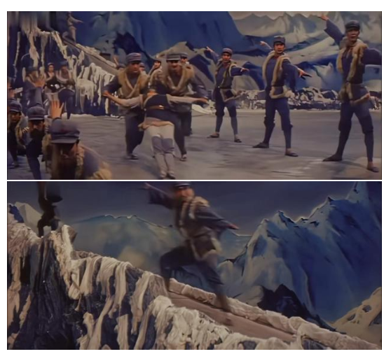 《紅軍不怕遠(yuǎn)征難》作為《中國(guó)革命之歌》中長(zhǎng)征主題片段,突破了單一形式局限,融合演唱、交響樂(lè)、舞蹈、布景、光影、朗誦與歷史影像,打造出立體視聽(tīng)效果。作品在宏大敘事中加入戰(zhàn)士互助、風(fēng)雪行軍等細(xì)膩細(xì)節(jié),強(qiáng)化人物情感與精神刻畫(huà),打破傳統(tǒng)敘事框架,為平衡歷史真實(shí)與藝術(shù)審美提供了獨(dú)特范本。