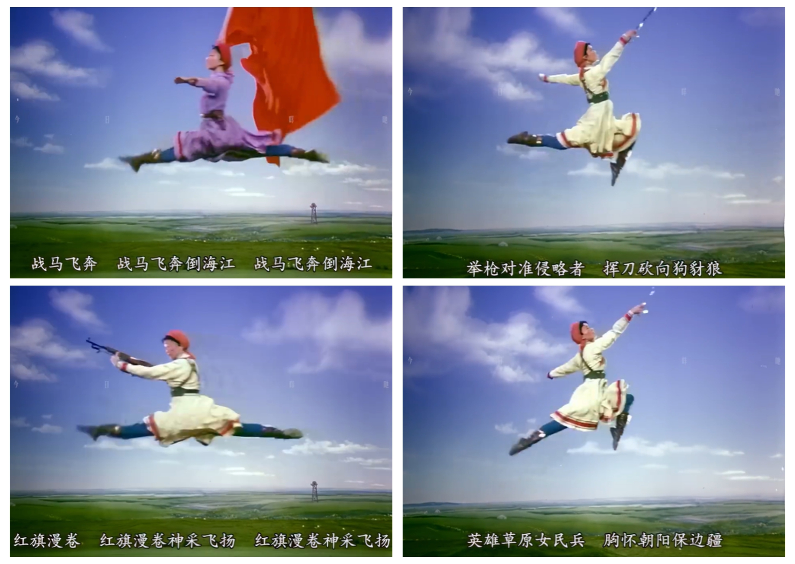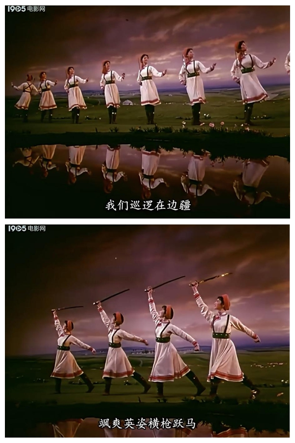 《草原女民兵》最初作為舞臺舞蹈,其美學(xué)特質(zhì)建立在現(xiàn)場性、即時性與三維空間性之上。而當(dāng)它通過《百花爭艷》的鏡頭被重新詮釋時,經(jīng)歷了一場深刻的美學(xué)轉(zhuǎn)換。電影不僅記錄了這一舞蹈,更通過其特有的語言系統(tǒng),對舞蹈進(jìn)行了二次創(chuàng)作與美學(xué)升華。