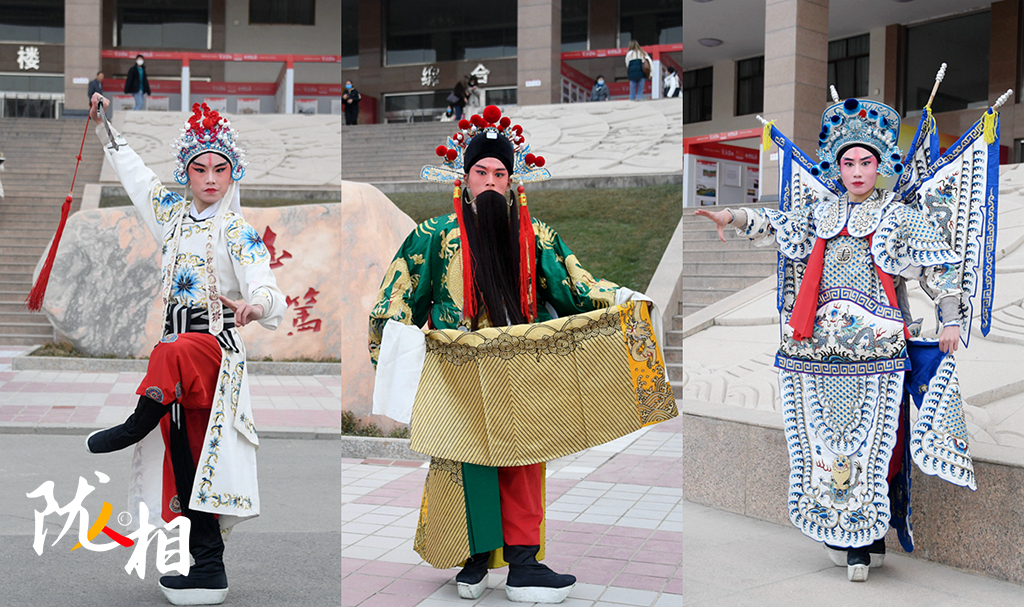 戲曲專業(yè)的學生戴著金龍同學制作的盔頭扮演不同的角色(拼版圖片)