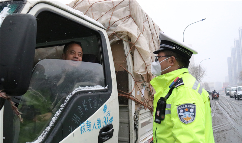 大隊(duì)領(lǐng)導(dǎo)實(shí)地查看道路通行情況,及時(shí)調(diào)整勤務(wù)模式和警力部署,確保降雪天氣各項(xiàng)安全“防控”措施落實(shí)到位。民輔警全員上路,強(qiáng)化重點(diǎn)路段巡邏管控和主要路口值守,對(duì)不具備通行條件車輛進(jìn)行勸返或提示繞行。通過鳴笛、喊話、閃爍警燈等措施,提醒駕駛員裝配防滑鏈,減緩車速、保持安全車距、注意觀察路面通行情況,引導(dǎo)車輛和行人安全有序通行。
