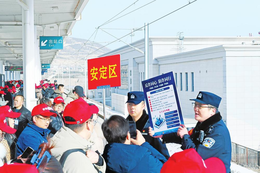 記者了解到,這批務(wù)工人員來(lái)自定西市各縣區(qū),既有返崗務(wù)工人員,也有新聘務(wù)工人員。為保障此次高鐵務(wù)工專(zhuān)列順利開(kāi)行,蘭州鐵路公安處定西北站派出所積極與定西北車(chē)站、客運(yùn)部門(mén)通聯(lián),專(zhuān)門(mén)開(kāi)辟“綠色通道”,暢通進(jìn)站、安檢、檢票等進(jìn)站環(huán)節(jié),劃定專(zhuān)門(mén)候車(chē)進(jìn)站區(qū)域,同時(shí)增派警力逐一引導(dǎo)務(wù)工人員有序進(jìn)站,幫助提拿大件行李、講解防范電信詐騙小妙招,用心用情保障務(wù)工旅客乘車(chē)安全。