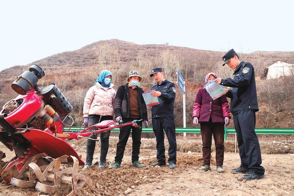 民警向農(nóng)機(jī)駕駛員普及安全知識(shí)。3月28日,漳縣公安局宣傳民輔警走進(jìn)田間地頭,為春耕生產(chǎn)保駕護(hù)航?!⌒赂拭C·甘肅法治報(bào)通訊員馮鵬兵攝